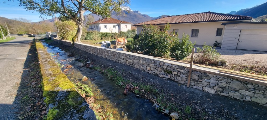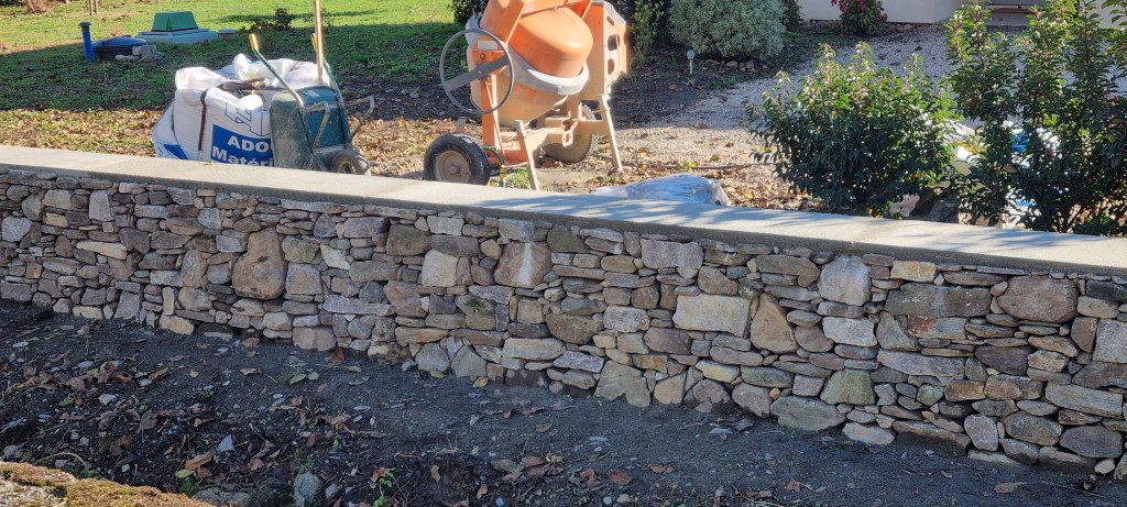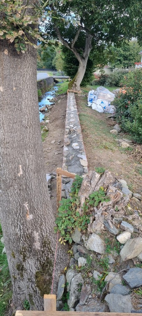 - Alignement et reconstruction type pierres sèches sur la base de l’ancien mur en conservant les arbres